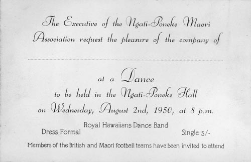 Social occasions organised by groups such as the Ngāti Pōneke Māori Association provided a welcome for Māori new to the city, and brought Māori and Pākehā into contact. Dances were often lavish, formal affairs, as this invitation of 1950 suggests.
